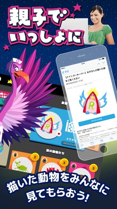 描いた動物の絵は簡単な操作で登録したお父さんやお母さんのメールアドレスに送信できます。