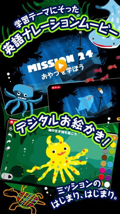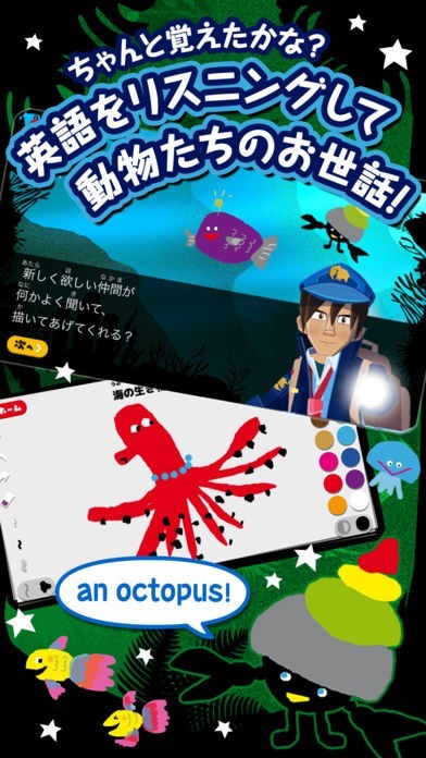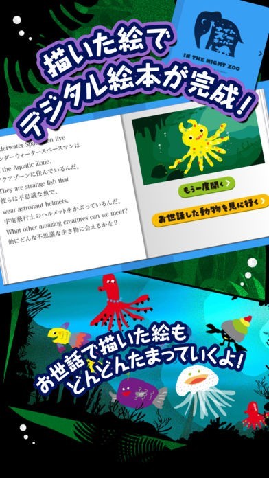 「クリエイティブイングリッシュ - ナイトズーキーパー」は、世界120カ国、5,000校以上の小学校で実際に導入されている子どもたちの想像力を育てることが出来る教育プログラムで、そのそのコンセプトをベースにして日本独自で新たに開発した英語を楽しく英語に慣れ親しみながら学習することが出来るアプリです。それだけではなく、「クリエイティブイングリッシュ - ナイトズーキーパー」は、自分が描いた絵でデジタル絵本を作ることもできるアプリです。