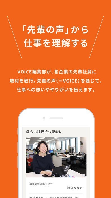 VOICE編集部が、各企業の先輩社員に取材を敢行。先輩の声(=VOICE)を通じて、仕事への想いややりがいを伝えます。