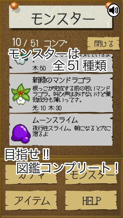全てのモンスターにはそれぞれ、習性や特徴を解説したコメントが用意されています。クスッと笑えるコメントも多く、モンスターたちが暮らす世界に想像を巡らせながらゲームを楽しむことができます。コンプリートまであと何体かを表示する機能もあり、集める楽しさに拍車をかけてくれます。
