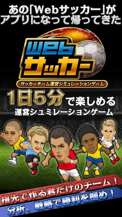 Webサッカーは、チーム運営が1日5分間でできます。自動試合機能があります。毎日、試合は自動的に行われます。試合はチームとして選んだ選手と監督に任せておきます。試合結果を見て、オーナーになったつもりで最強チームを作っていきます。登録している選手は1,000人を超えます。新しく選手を獲得したり、監督を変更したりして世界に通用するチームにするのが目標です。ドット絵がかわいく、有名選手に似ているので共感できます。サッカーの試合をするゲームではなく、チーム編成で戦略を考え強化します。 毎日短時間の操作で手軽に遊べます。仕事合間の息抜きや毎日の楽しみになります。