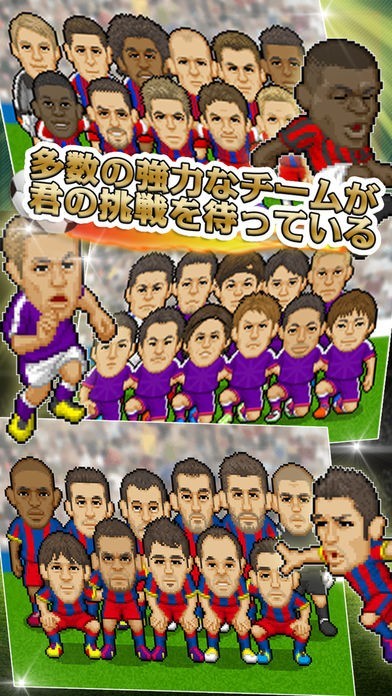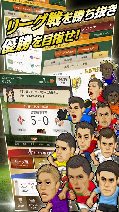 新しく選手を獲得したり、監督を変更したりして世界に通用するチームにするのが目標です。ドット絵がかわいく、有名選手に似ているので共感できます。チーム編成で戦略を考え強化します。