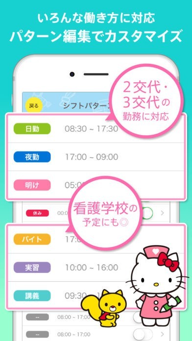普通の「日勤」や「準夜勤」の基本的なシフトだけではなくいつもと違う時間から始まったり会議や「早番」などの勤務パターンがあってもスケジュールに入力するスタンプの時間と表示をカスタマイズできるのでしっかりと管理することができます。