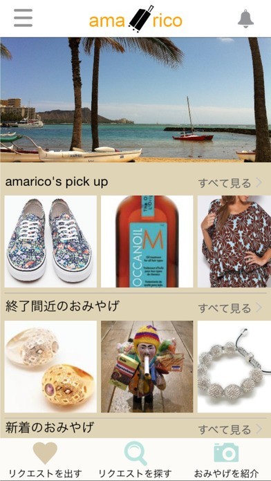 「amarico」は、海外旅行のお土産の売り買いが楽しめるフリマツールです。 現地でしか買えない商品が欲しい時には「リクエスター」として、海外旅行中のユーザーに商品購入をお願いしてみましょう。 対応できるユーザーは「トラベラー」としてお土産を代理購入。 商品をリクエスター宛てに発送したら、代金の振り込みを受け取ります。 イチオシ商品をフリマ感覚で出品することもできる他、リクエストの検索が行えるのも楽しいポイント。 ずらりと並んだ出品商品はタップするだけで詳細画面を確認することができます。