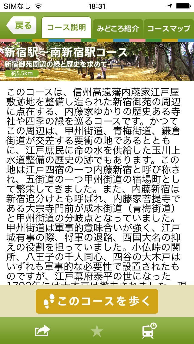 小田急線沿線の70種類の散歩コースが表示されるアプリです。地図で散歩コースが表示されるほか、各コースのみどころも表示されるので沿線の文化財や自然などとふれあいながら散歩を楽しむことができます。エリアや季節、花などからコースが選べるので、興味があるコースを歩いてみましょう。コースのみどころは写真で表示されるので分かりやすいです。お気に入り登録すればコースをいつでも確認できるので、何度も同じコースを歩けます。小田急電鉄公式アプリなので、信頼できる正確な情報が掲載されており安心です。