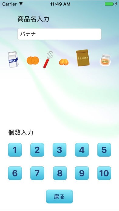 1. 「買うもの追加」ボタンを押し、商品名を入力し、購入する個数のボタンを押します。