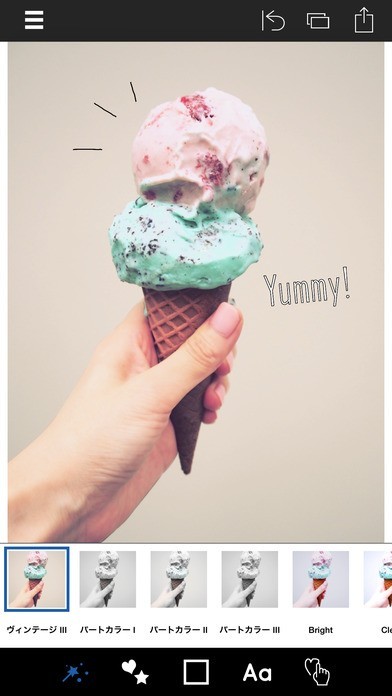 スタンプを自分で作成することができる、画像加工アプリ、淡い配色や、手描き風スタンプで、優しい雰囲気の写真にアレンジ