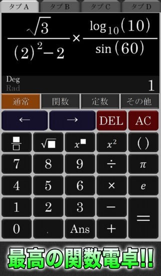関数に特化した理系学生必須のアプリが誕生! 機能が充実しているのに、複雑な計算も簡単に入力できるので一番使いやすい。 黒ベースのシンプルなデザインで、目が疲れにくく、計算式も見やすく表示。 三角関数、双曲線関数をはじめ、物理化学でよく使用される科学定数も収録。 分数やルートを表示できるので、数式が見やすくきれい。 タブ機能でほかのタブの解をほかのタブで使用することもできます。 日本語だけではなく英語表記に切り替え可能。切り替えるときのかっこいいスライドアクションにも注目です!