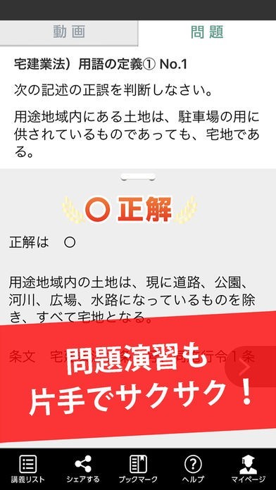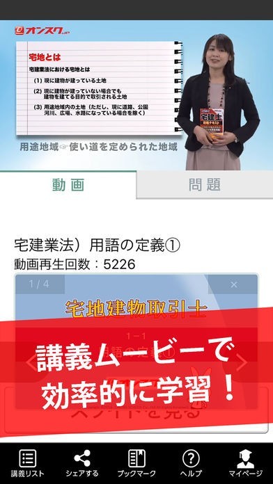 「オンスク.JP」では、宅建などの資格を取るために動画による学習を行うことができ、そしてその映像を見てから問題を解くことによって、復習をすること、記憶を確かめることを両方ともに話すことができます。 解らなかった問題があれば、ブックマークしておくことであとで確認したりもできます。 さらに、「講義リスト」を見ることによって学習したい部分をすぐにチェックすることができます。 他には、「シェアする」によって、学んだ内容を友達に知らせたりすることもできます。