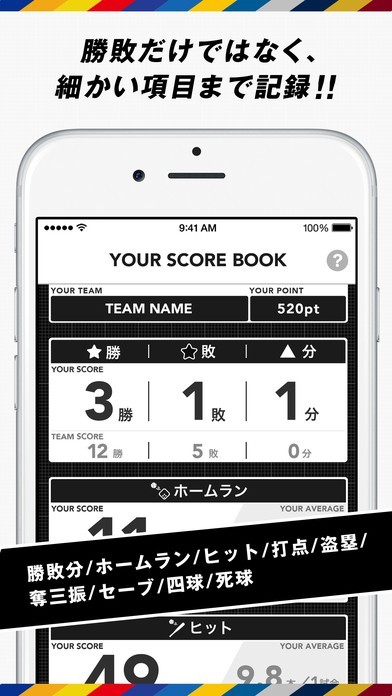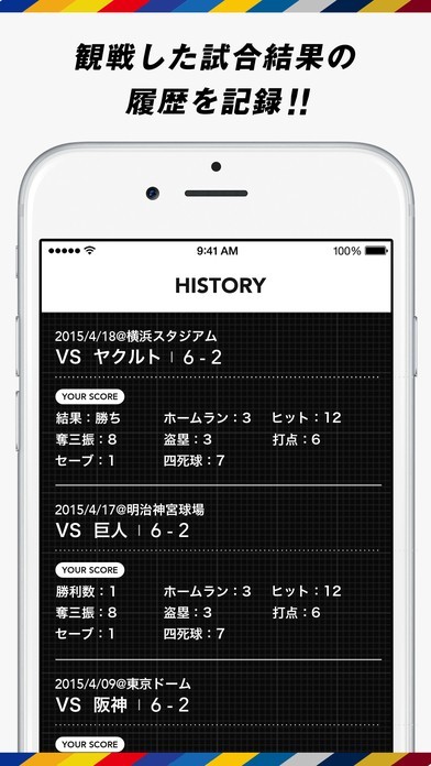 「FAN SCORE BOOK」では、プロ野球を観戦するかたがよく言いがちな「自分が行った試合では勝てない」、「いつも一点差の試合になる」などというようなことは本当なのかをデータによって示してくれます。 まず、お好きな球団を選び、観戦しにいった試合はスタジアムで位置情報を活用することによって「チェックイン」できます。 あとは、全試合と、「チェックイン」した試合とを比較することによって、自分のジンクスは本当なのかを知ることが出来ます。 また、「ヒストリー」によって、訪れた試合を振り返ることができることから思い出にもなります。 そして、なによりデータを見ることによってファン同士での話の種として使うことができます。