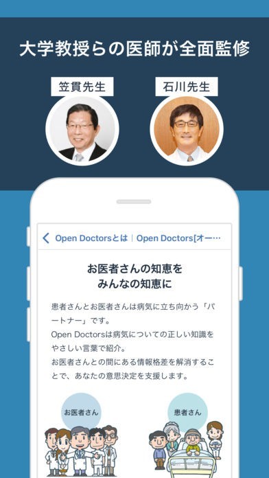 家族や自分が重い病を診断された。どんな病気で、どんな治療法があるのか知りたい。「オープンドクターズ」はそんな人におすすめの医療アプリです。医療の専門知識がない方でも、お医者さん並みの知識を分かりやすく知ることができます。