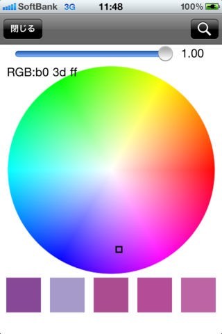 画面中央の円形の画像をタップすると、その位置にポインターが移動し、ポインター位置の色に近い5色が画面下に表示されます。また、画面上のスライドバーをドラッグす-