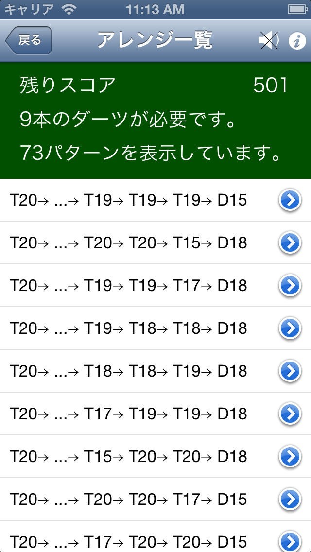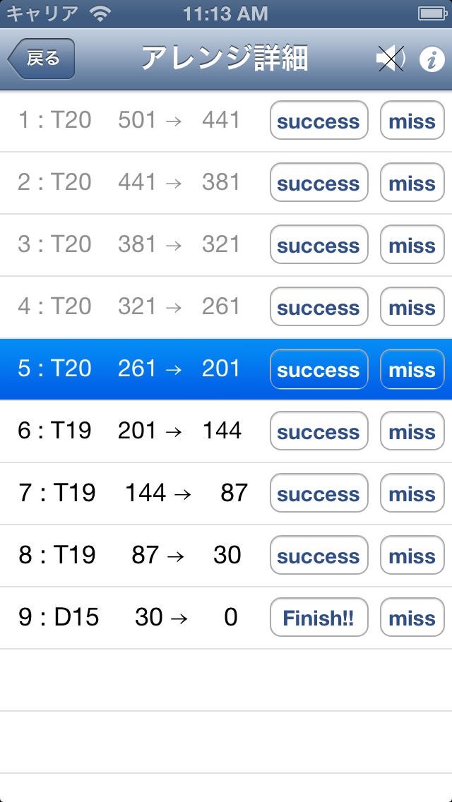 計算ミスを防いで、持ち点を減らせるパターンをいくつか表示し、好みの方法を選ぶことができます。多いときは10種類以上のパターンがあります。新しいアレンジ法を発見したい時に便利です。アレンジ練習のためのミニゲームもあります。ダーツの攻略法を身に着けることができます。