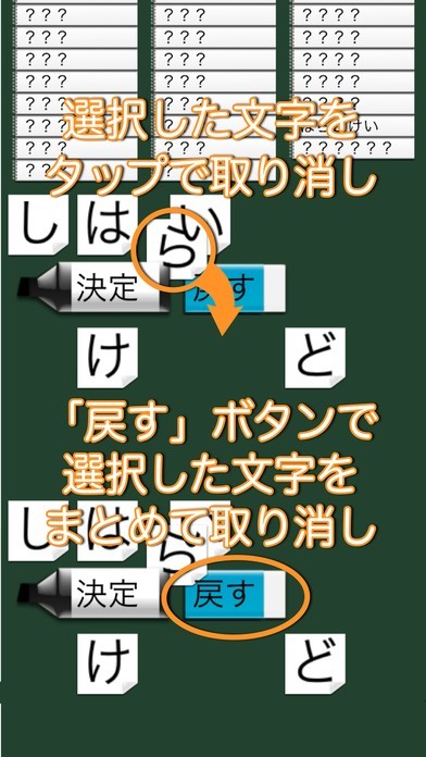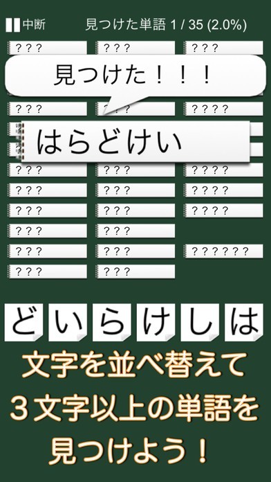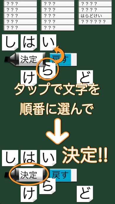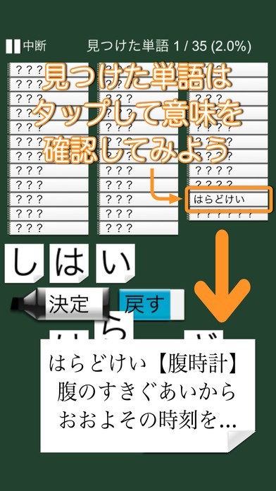 スクリーンにいくつかのひらがなが表示されますので、それらを組み合わせて単語を作るというゲームアプリになっています。文字自体はタップすると移動できるので、操作方法は簡単です。そのため単語を覚えたてもお子様から、頭の運動をしたいという大人まで幅広い年代で使うことができます。うまく単語になると、その意味も表示されますので、いい勉強にもなるでしょう。いくつもの単語が出るので、分からない時は降参して答えを表示させることもできます。