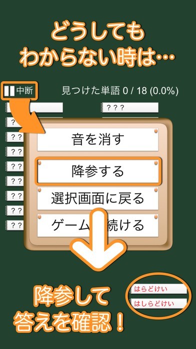 分からないと降参でき、答えが確認できます