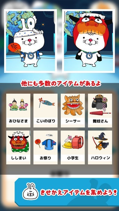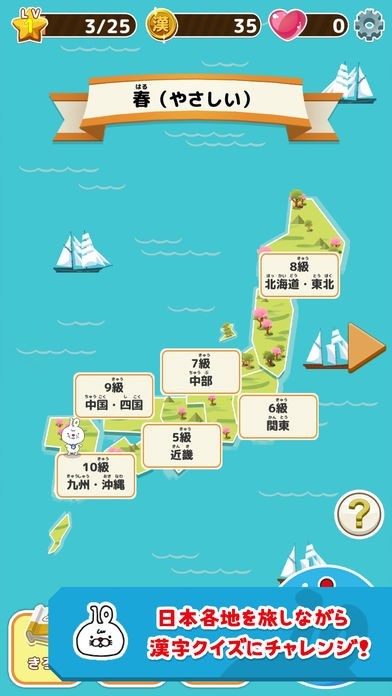 日本各地を旅しながら漢字問題を解いていくと、新しいキャラクターやきせかえアイテムをゲットできます!