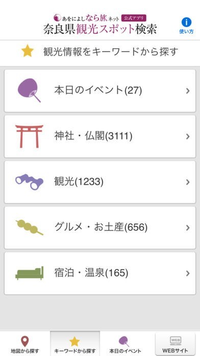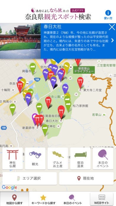 奈良県観光公式サイト「あをによしなら旅ネット」に登録されている観光施設やイベント情報を地図やジャンルで検索する事ができます。