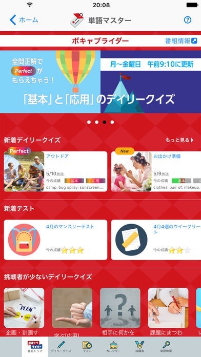 単語マスター(英語)ではデイリークイズとテスト形式の問題があります。デイリークイズで基本と応用を身につけたら、ウィークリーテスト、マンスリーテストでどれだけ力がついたか試すことができます。ゲーム感覚なので楽しんでいるうちに英語が覚えられますよ。