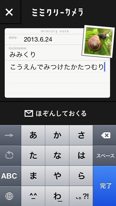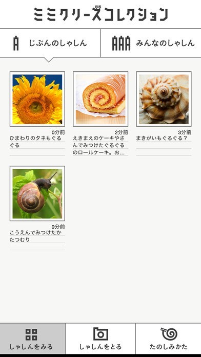 Eテレで人気の教育番組から公式カメラアプリが登場! 「NHK ミミクリーカメラ」は、自然の中から似ているものを発見して楽しむアプリです。 渦巻きが似ている台風とカタツムリ、蚊取り線香など、似ているものを見つけたら「しゃしんをとる」機能でカメラを起動して撮影してみましょう。 「しゃしんをみる」機能からは今まで撮影した写真の一覧表示が行える他、ミミクリーズコレクションとして他ユーザーの写真も閲覧可能。 「ほぞんしておくる」機能を利用すれば番組への投稿も行えるなど、親子で一緒に楽しめる要素が満載です。