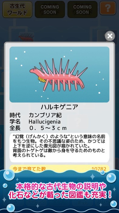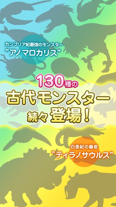 カラフルで愛らしいイラストで描かれた古代モンスターたちがたくさん登場!カンブリア紀最強のモンスター「アノマロカリス」や、白亜紀の暴君「ティラノサウルス」、生きた化石「シーラカンス」など。130種もの古代モンスターへ進化させることができる。進化させた生物をシェアボタンで友達に自慢しよう!