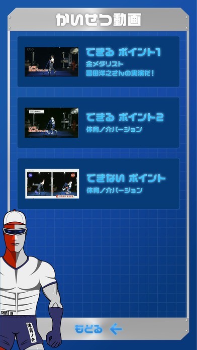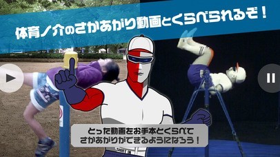 「NHK スクール体育 はりきり体育ノ介」では、かっこいいキャラクターが登場してさかあがりを指導してくれるアプリです。操作方法は誰でも至って簡単です。まずは「解説動画」から見たいショートムービーをタップして視聴します。見終えたら実際にさかあがりに挑戦してみましょう。そのあいだ親御さんはその姿を横からアプリで撮影します。撮影したムービーは見本と横に並べて比較する事で間違ったフォーメーションをすぐに見つけることが可能です。