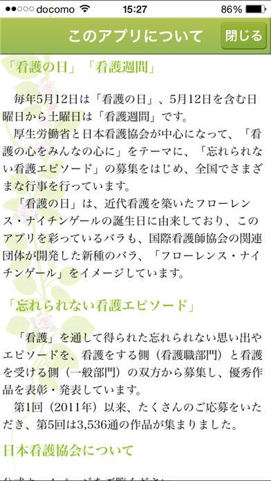 厚生労働省および日本看護協会によって募集された感動の看護エピソードを読むことができるアプリです。 看護の日にちなんで集められたエピソードを収録! 看護師さんと患者さんの交流にまつわる話は、心温まるものばかりです。 2011年に初回の募集が行われて以来、看護の日や看護週間の毎年の恒例行事として親しまれています。 看護や看護、医療の現場で働いている方や、ご家族の看護をされている方には特に共感できるエピソードも多いのではないでしょうか。