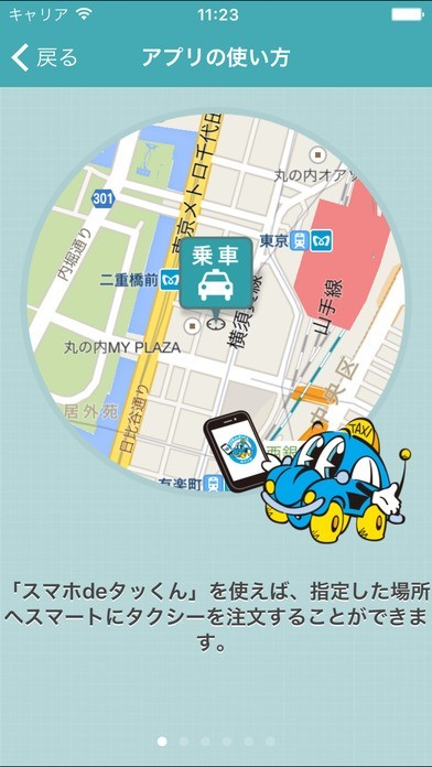 App Storeより引用「スマホdeタッくん」はスマートフォンならではの直感的な操作とGPS機能で、東京都内を走る複数のタクシー事業会社のタクシーのなかから、お客様が指定する場所近くを走行中のタクシーを簡単に呼ぶことのできるアプリケーションです。