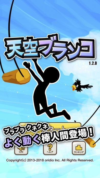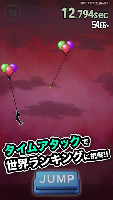 手軽な操作で爽快感が味わえる「天空ブランコ」は、指先1つで遊べるカジュアルゲームです。 プレイヤーが操作するのはシンプルな棒人間。 天空を舞台に風船や足場などを掴んで先へと進んでいきます。 障害物を上手に避けながら進むのがハイスコアを目指しましょう! 画面に設置されたジャンプボタンを押すことで棒人間がジャンプ。重ねてもう1度押せば2段ジャンプが行えます。 ノーマルモードと2種類のタイムアタックモードを搭載する他、スコアやクリアランクはシェア機能を利用してSNSに投稿できるようになっています。