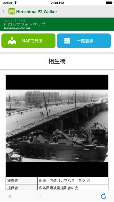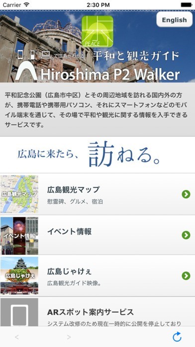 App Storeより引用広島P2ウォーカーは、広島平和記念公園とその周辺地域を訪れる国内外の方が、携帯電話や携帯用パソコン、それにスマートフォンなどのモバイル端末を通じて、その場で平和や観光に関する情報を入手できるサービスです。