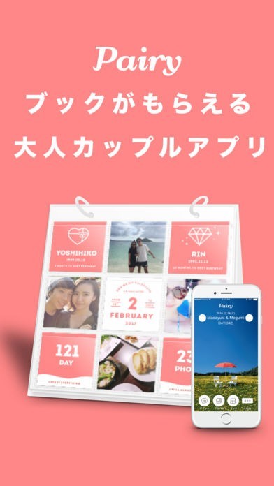 二人だけの思い出を残せる、デートをもっと楽しくしてくれるアプリ「Pairy」 使い勝手がバツグンで、さまざまな機能が備わっているのでかなり便利です。 いろんな記念日に対応したカウントダウンや、ペアプロフなど、二人の特別感も満載です。 また、おすすめのデートスポットの表示や、いろんな場所で使うことのできるプレミアムパスなど、デートを特別なものにしてくれるサポートもたくさんあります。 アルバム機能とその写真をまとめてくれるブック機能もあり、使っていて楽しいアプリになっています。