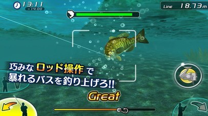 "バスフィッシング3DⅡ"は、その名の通り本格的なバス釣りが楽しめるカジュアルゲームとなっています。遊び方は、ボートに乗りバスの群まで漕いでいき、ルアーアクションでバスを狙い、ヒットしたらフィッシュファイトを開始します。リールを巻くタイミングを間違えると、ラインが切れてしまうため、巧みにロッドを動かす操作がポイントとなってきます。バスがカーソルの中央にきたらリールを巻き、カーソルから外れたらロッドを動かすといった感じです。また、水中カメラで水中を覗く事ができ、魚がどれ位の水深に潜んでいるのか確認でき、状況にあったルアーを選択したりと、豊富な装備品を駆使するのも楽しい遊び方です。釣りが趣味の方も、初心者の方も、リアルな3Dグラフィックで本格的なバス釣りが楽しめます。