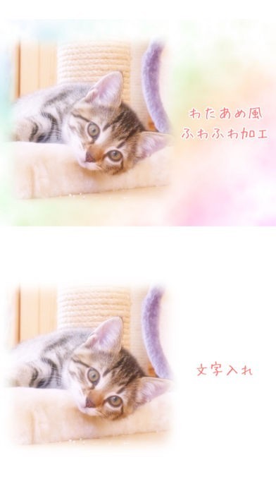 わたあめカメラは、撮影した写真がわたあめのような、ふわふわとした仕上がりになります。写真をかわいくしたいときに、ふわふわフィルタを使用します。優しい雰囲気になり、好みに合わせて調節が可能です。色や形状を選択するとふわっと色づきます。122の色から色を選択できるので、オリジナルの写真に仕上がります。 シェイプ機能があります。ぼかし具合や色の量、濃さは細かく調節できます。色を組み合わせることも可能です。くるくると回して、ぼかしを入れながらカラフルに加工していきます。文字入れもでき、ポストカードも作れます。普通の写真では物足りないときに、簡単に加工ができます。