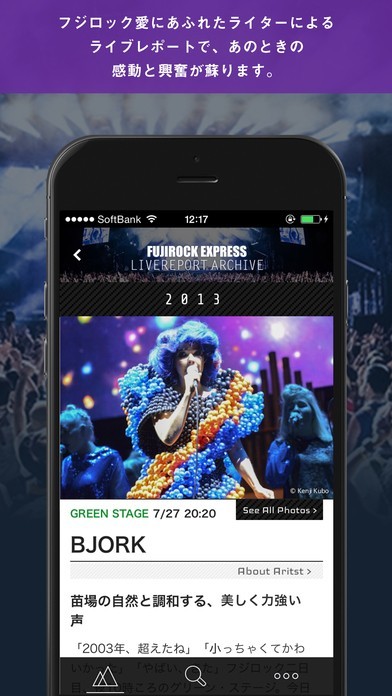 本アプリには、2010年〜2015年に開催されたフジロックフェスティバルのライブレポが掲載されています。しかも、この期間に開催されたすべてのライブレポが読めるという豪華な内容!ひとつひとつのライブレポは、興奮が伝わってきそうな迫力の写真付きです。したがって「あの思い出のステージをもう一度見たい」とか「見逃してしまったあのアーティストのステージを見たい」、「フジロックフェスティバルに参加したことはないけど、これから参加してみたいから予習しておきたい」などという思いに応えてくれます。ライブの検索は、アーティストや日程から絞り込めばOKなので簡単です。