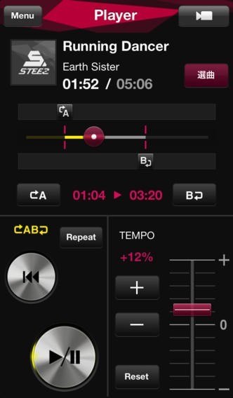 ABリピート機能によって、特定のパートを納得いくまで練習できる。