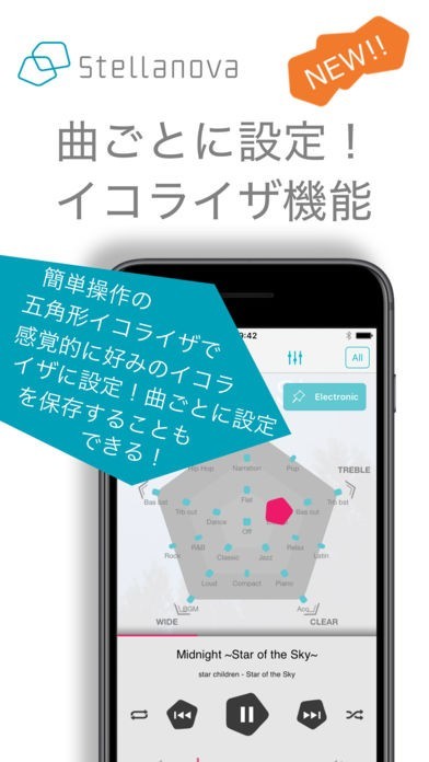 タップやドラッグで簡単に操作することができる五角形イコライザー機能を搭載しているので、音楽に詳しくない人でも直感的に音質を調整することが出来るようになっています。