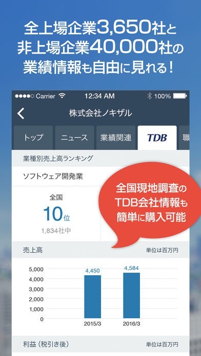 約40万社の企業情報と全上場企業を含めた約4万社の業績情報が収録されたアプリ!