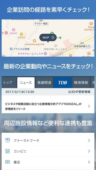 ビジネスはもちろん、就職試験や転職などにも役立つアプリが「NOKIZALpoweredby帝国データバンク」です。このアプリは日本の全上場企業3650社と非上場企業40000社の企業情報や業績情報などをスマートフォンで閲覧することができるようになっています。検索した企業はお気に入りに登録しておけばすぐに閲覧することが出来るので、転職や就職の面接前などにも役立てることができます。基本的な企業情報については無料で閲覧することができるようになっていますが、詳細な約20項目を閲覧することができるTDB会社情報を利用するためには600円が必要になります。