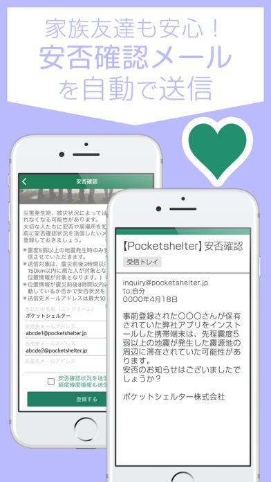 普段は観光情報満載のナビアプリとして利用することが出来るけれど、災害が発生したときには警報に連動することで自動的に防災モードに切り替わってくれるアプリが「ポケットシェルター」です。通常時はオフラインでも使えて地図上で各施設を検索することが出来るようになっていますが、防災モードに切り替わると地震速報やミサイル警報をプッシュ通知でお知らせしてくれるようになっているだけでなく、あらかじめ設定しておいた安否確認メールを一斉送信してくれます。
