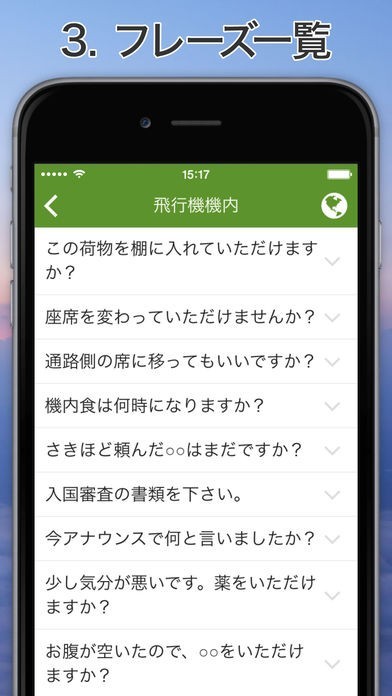 200種類以上のフレーズを収録していて、旅行する時のガイドとして活用出来るようになっています。一覧で翻訳したいフレーズを確認することが可能で、音声で読み上げてくれます。