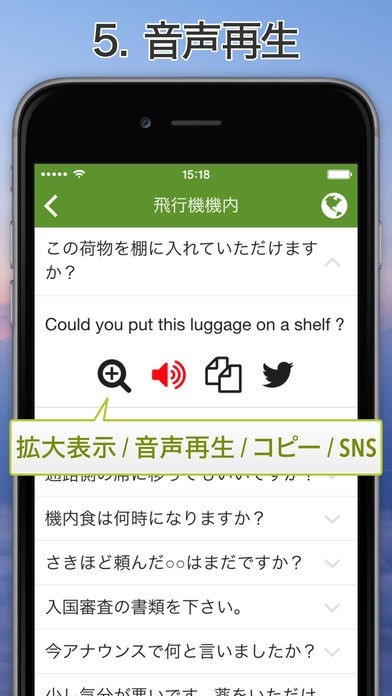 タクシーやホテル等のシチュエーションに対応していて、現地の人と簡単にコミュニケーション出来るようになっています。翻訳された英語をSNSに共有していけるのも利点でしょう。