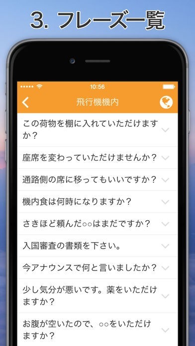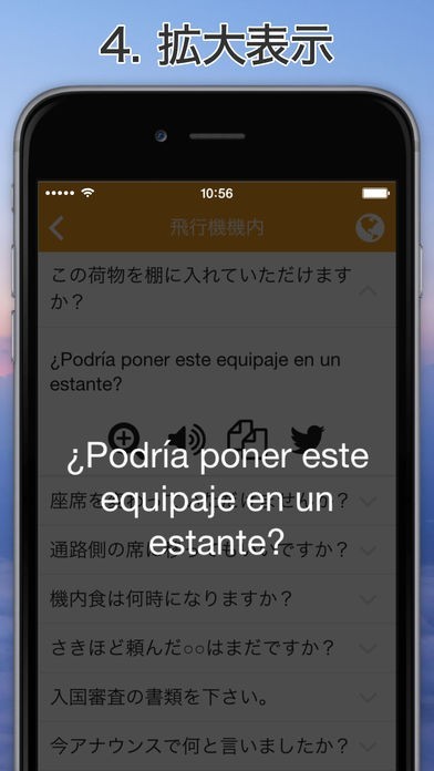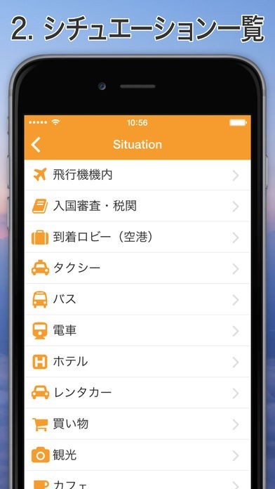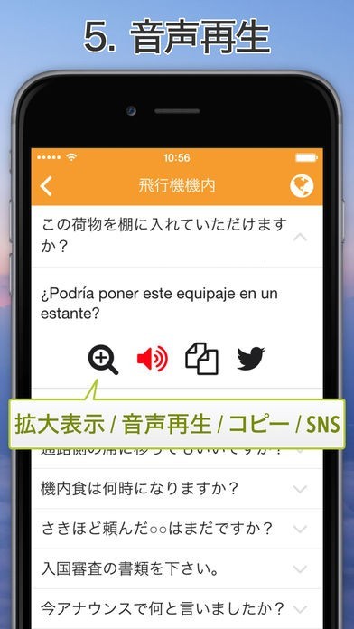 旅行や出張などでスペイン語圏の国へ訪れる際に役に立つフレーズが満載のアプリとなっていて、入国審査やショッピングなどのシチュエーションに合わせて分類されています。