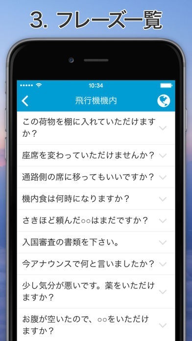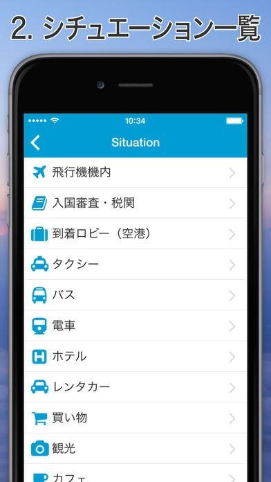 シチュエーション一覧機能から必要なフレーズを楽々選択!現地での会話に役立つ音声再生機能も搭載!