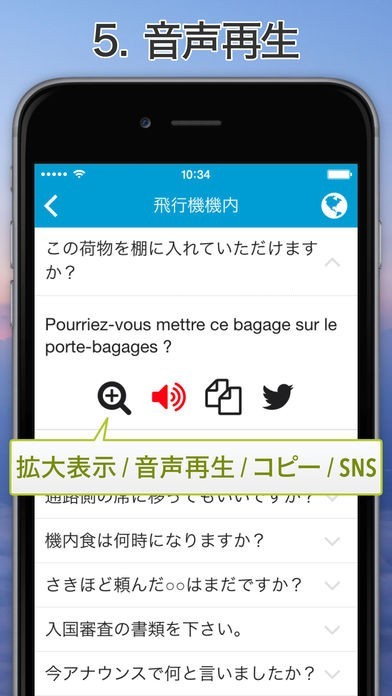 フランス旅行で活躍間違いなしの「Excuse Me French」は、多彩なフレーズを収録した便利アプリです。 日本語や英語などの5言語からフランス語への変換が可能。 飛行機案内や到着、ホテル、買い物などのシチュエーションに、200ものフレーズを利用できるようになっています。 文章の拡大表示の他、スピーカーマークをタップすることで音声再生が行えるのも便利なポイント。 買い物はもちろんのこと、ホテルでの手続きやちょっとした会話などに、拡大したテキストや音声再生が役立ってくれるでしょう。