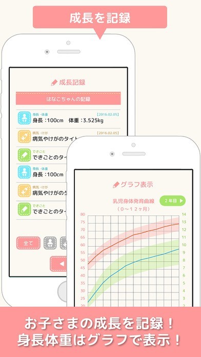 成長の記録で入力した身長・体重を元に、自動でグラフを生成する機能も備えており、