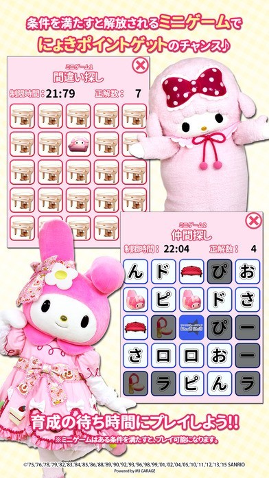 「サンリオピューロランドにょっきにょき」はお馴染みのサンリオキャラクターを集めるゲームです。カプセルを放置で様々なキャラクターを集められる!登録された図鑑をみれば、詳細なプロフィールを確認することができます。集めたキャラクターの数が増えると、2種類のミニゲームに挑戦することが可能。間違い探しや仲間探しに挑戦、成績によってポイントを貰えます。ポイントが貯まれば一度に設置できるカプセルが増えるので、キャラクターも集まりやすくなります。さらに、様々な条件を満たせば、オリジナル壁紙のプレゼントも貰えます。