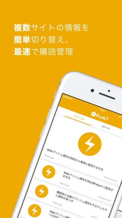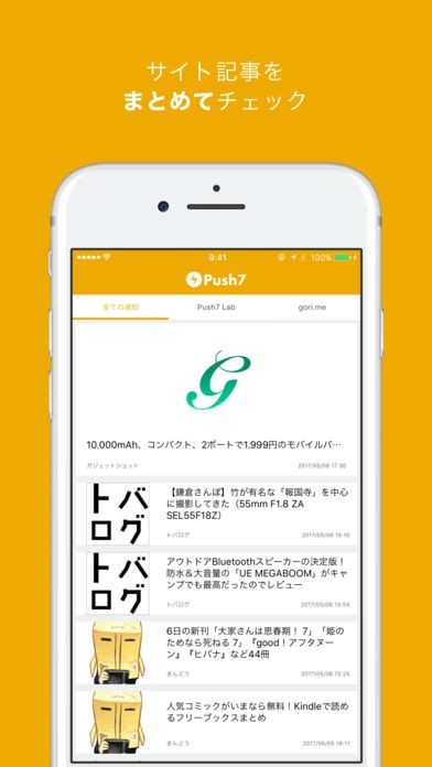 「Push7」はWebサイト上のブログやニュース、天気予報などの更新情報をプッシュ通知で受けとることができるアプリです。ブラウザの気になるページはブックマークすることはできますが、ブックマークではいつ新しい記事が更新されたかがわかりませんが、このアプリを導入するとお気に入りのサイトの最新記事にいち早く気づくことができます。