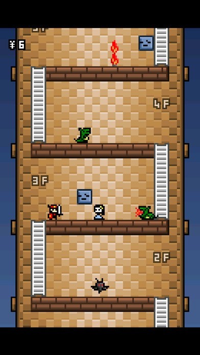 「8歩の塔」は、僅か8歩で階段に辿り着き、ドンドン上の階を目指していくというシンプルながら奥の深いゲームです。操作方法はとても簡単で、一度タップすると、主人公が1歩進みます。基本はこれで8歩歩いて梯子に辿り着き、上の階に進んでいくだけなのですが、途中には様々なモンスターが待ち構えています。素早くダブルタップすると、剣を出して敵を倒しますので、上手く利用して上の階に進んで行きましょう。モンスターの中には倒せないモンスターもいるので、注意が必要です。また、女の子が居た場合は倒してはいけないので、ゆっくりタップして通り過ぎましょう。様々なモンスターの出現や、女の子に気を付けて通っていると、僅か8歩なのにとても頭を使う事間違い無しのゲームです。
