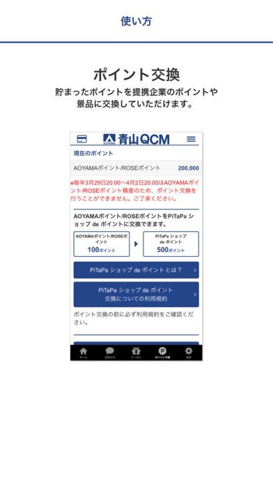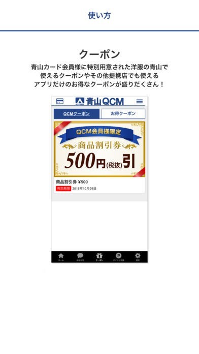 "青山QCMアプリ"は、洋服の青山のメンバーズカード"青山カード"の公式アプリで、モバイル会員証として利用ができる便利なアプリです。洋服の青山や、提携店で利用できるクーポン配信の他、キャンペーンやお役立ち情報などの嬉しいアプリ限定の特典が満載で、青山カード会員の方には見逃せないサービスとなっています。