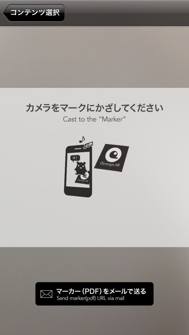 ここでマーカー画像が必要なコンテンツの場合は画面下部に"マーカー(PDF)をメールで送る"というボタンが表示されますので、このボタンをタップします。