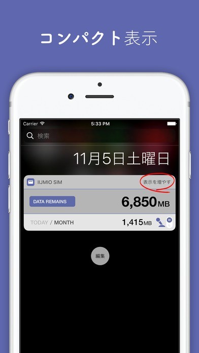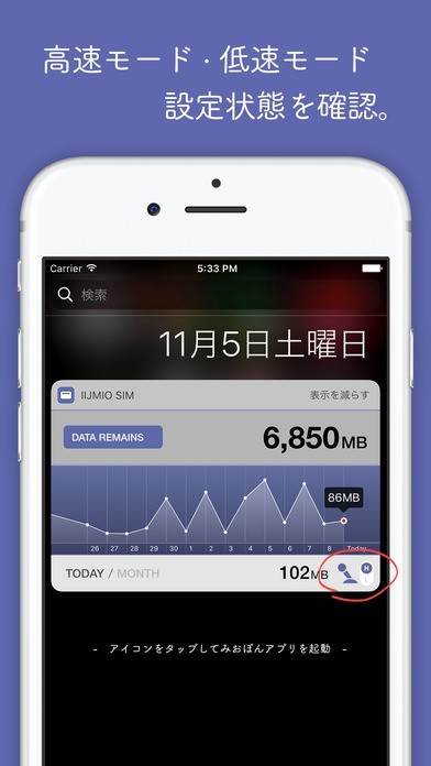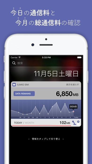 格安simでおなじみの「IIJmio」のデータsimや、音声通話simを購入したユーザーに、契約した通信量をウィジェットからすぐに確認することが可能となっております。